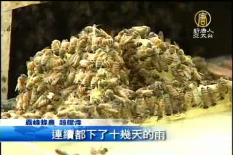 【新唐人亞太台2013年5月15日訊】每年四、五月是蜂蜜產季,不過今年受到氣候高溫多雨影響,花期提早,蜂蜜採收期也跟著提前, 但前一陣子連日大雨,蜜蜂無法外出採蜜,台中地區的蜂農說,今年蜂蜜產量比往年少了近九成,蜂農血本無歸,可以說是最慘的一年。