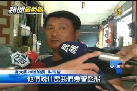 「根本就沒撞到,他們說什麼我們急著登船,有的沒的,哪有什麼浮標啊?(都沒有?)它從之前就一直說謊說到現在了,你們還要相信嗎?有證據拿出來嘛,對不對?他們說有拍到錄影帶啊,叫他們錄影帶公布嘛!」