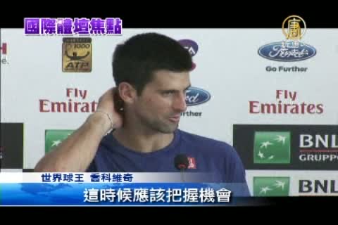 【新唐人亞太台2013年5月18日訊】世界球王喬科維奇在紅土球場上似乎還未找到維持穩定的方式,17日在羅馬名人賽中大爆冷門,再度吞下重大敗仗;另一方面,西班牙蠻牛納達爾以6比4、4比6、6比2擊敗世界排名第4位的同胞費瑞爾取得晉級。