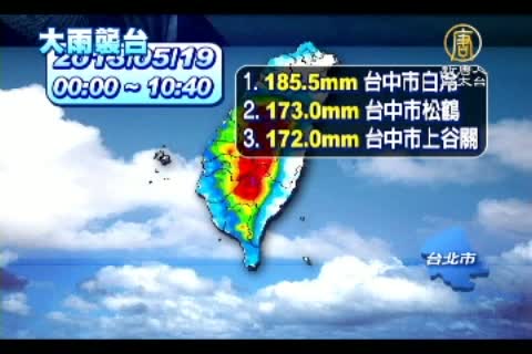 【新唐人亞太台2013年5月19日訊】今年梅雨最大鋒面接近影響,從19日開始,一連五天,全台都會受到影響,中部山區早上累積雨量已經超過180毫米,而且從禮拜一到禮拜三,西半部從山區到平地,還會出現大豪雨等級的雨量,氣象局預報中心主任鄭明典還在臉書上警告,鋒面經過的時候,將會帶來狂風暴雨的天氣。