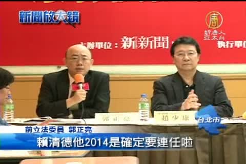 前立法委員 郭正亮:「賴清德他2014是確定要連任啦,那2014年底選完,總統的初選是2015年五六月,所以現實上不可能(選總統)啦,這一次絕對不可能啦,那未來當然機會非常大,機會非常大。」