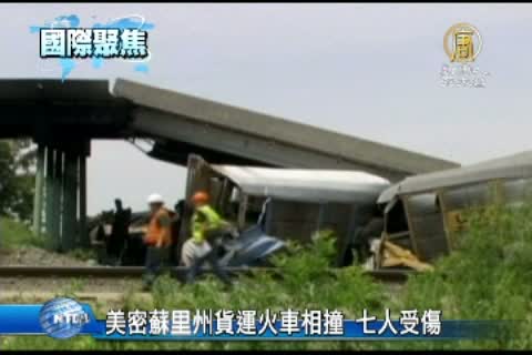【新唐人亞太台2013年5月26日訊】一個多星期前,美國康乃狄克州才發生客運列車出軌,導致七十多人受傷。5月25日(星期六),美國密蘇里州又發生兩列貨運火車相撞事故,並且撞上橋墩,導致橋梁坍塌、七人受傷。