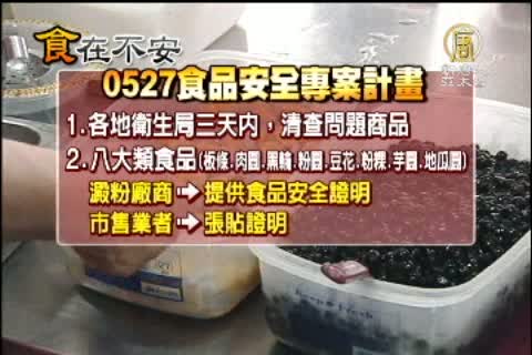 【新唐人亞太台2013年5月28日訊】昨天(27日)衛生署宣布,啟動「0527食安專案計畫」,要求各地衛生局3天內清查、清除所有問題產品,即日起原料廠必須針對八大類產品,提供安全證明,販售澱粉類產品的店家也必須張貼公告自清,不過走一趟市場和冰品店,卻有好多商家,早在衛生署宣布前,也等不及上游業者提供證明,早就將產品送去抽驗,甚至還有攤商,連八大類以外的麵粉,也送去檢查。