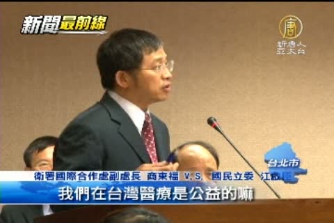 衛署國際合作處副處長 商東福 V.S. 國民立委 江啟臣:「聘請過去,即便是短期的,即便是短期的,這會不會發生?」「目前的評估是不會,因為這邊提的法規例如是說,比如說,我們在台灣醫療是公益的嘛,可是在那邊他們有一些潛規則」「我跟你講,我還是請衛生署,這部分你們要慎重。」