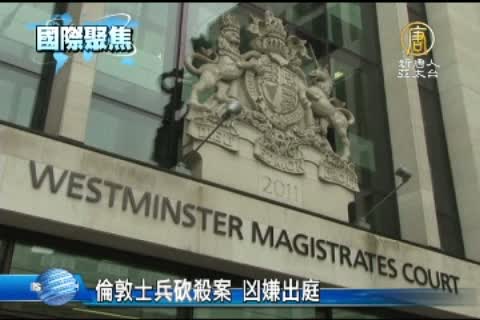 【新唐人亞太台2013年5月31日訊】上週在倫敦街頭砍殺一名士兵的嫌犯亞德博瓦勒,被控謀殺罪和非法持有槍支。星期四(30號)他在威斯敏斯特地方法院出庭,法庭外戒備森嚴。