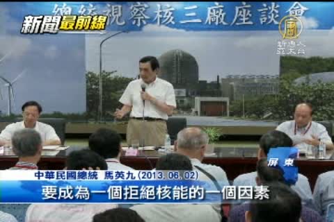 【新唐人亞太台2013年6月3日訊】來看到馬總統這兩天的能源之旅,繼昨天晚間夜宿屏東核三廠後,馬總統今天又視察了還在興建中的核四廠,場外聚集超過百位反核人士抗議。馬總統表示,興建核四是政策,沒有改變,不過馬總統的宣示,並沒有消除民眾對核電安全的恐懼。