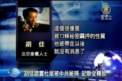 【新唐人亞太台2013年6月8日訊】大陸著名維權人士胡佳星期五證實,曾被傳失蹤一周的前《紐約時報》攝影師杜斌,5月31日被北京市公安局秘密抓捕,目前下落不明。國際記者聯會發表聲明譴責中共打壓記者,並呼籲歐習會談期間,盡快釋放杜斌。