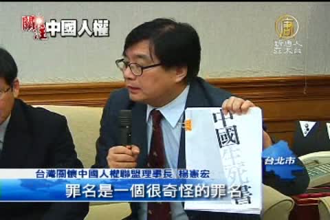 台灣關懷中國人權聯盟理事長 楊憲宏:「中共對於陳光誠要來台灣,是高度的緊張,然後也一直給我們很多干擾,杜斌,5月31日被捕,罪名是一個很奇怪的罪名,我不曉得法律專家如何解釋,『非法出版罪』,『非法出版罪』,不曉得是甚麼東西,所以一定要在台灣發出聲音。」
