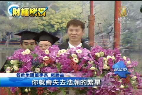 【新唐人亞太台2013年6月15日訊】日前語出驚人建議月薪低於5萬元不要儲蓄的餐飲集團董事長戴勝益,今天他在台大畢業典禮上致詞時,對著台下畢業生當場改口,把5萬下修到低於3萬元才不要儲蓄,而且還秀出自己一身平價衣褲、手表,而且也期勉學弟妹別羨慕有錢人高價行頭、也別盲目的追求名牌。