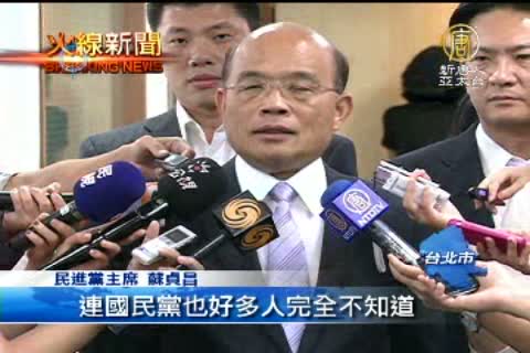 民進黨主席 蘇貞昌:「對於馬政府最近以來,處理兩岸關係的問題,深感失望。都是只有少部分人密室作業,不要說排除讓社會大眾了解,排除民進黨參與,連國民黨也好多人不知道。」