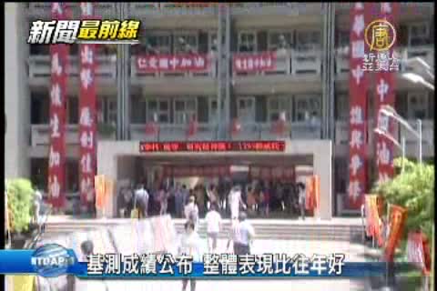 【新唐人亞太台2013年6月19日訊】國中基測今天公布成績,心測中心表示,考生整體表現比往年好,PR值落在93或94的考生,應該可以申請到去年PR95才能申請上的學校,不過由於這是最後一次的國中基測,末代考生如果想要重考,明年得依照12年國教的題型方向來準備。