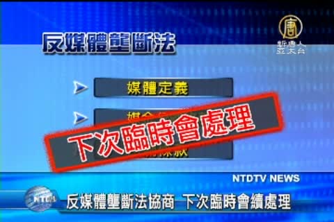 【新唐人亞太台2013年6月26日訊】立院臨時會的另一個焦點,傳播學界矚目的反媒體壟斷法,今天在交通委員會進行朝野協商,NCC主委石世豪出席討論,不過,朝野立委無共識,沒能完成初審,還有多項爭議留在二次臨時會處理。