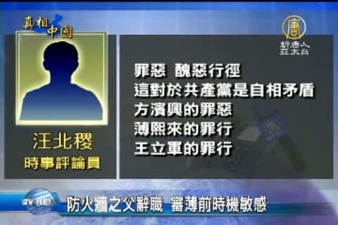 時事評論員 汪北稷:「方濱興病退,你卻不全面否定『防火牆』,就像10多年前,把陳希同抓起來,你卻不否定他在『六四』當中的罪惡、醜惡行徑,這對於共產黨是自相矛盾的。方濱興的罪惡,薄熙來的罪行,王立軍的罪行,他們這個集團的罪行,是共產黨罪行不可分割的一部分,看清楚這種罪行,就該徹底的否定它,不能留有餘地。」