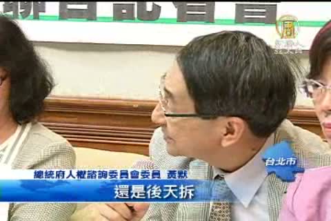 【新唐人亞太台2013年7月4日訊】大埔拆遷案的抗議衝突後,多位學者專家今天下午也召開聲援記者會。總統府人權諮詢委員提醒,聽證會前應該緩拆大埔。學者還將矛頭對準三年前承諾大埔原地原屋保留的副總統吳敦義,要求他不能背信忘義。