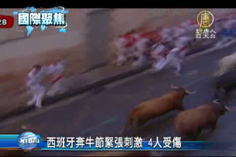 【新唐人亞太台2013年7月8日訊】西班牙聖佛明節星期天(7號)開幕,尋求刺激的民眾特別趕到北部城市班普羅納參加奔牛活動,與12隻重達半公噸、長著尖角的鬥牛一起奔跑,歡度刺激星期天,所幸這次只有4人受傷,沒有人遭牛角頂傷。