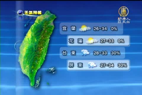 【新唐人亞太台2013年7月9日訊】來關心天氣,星期三(10號)臺灣各地及外島依然是高溫炎熱的天氣,午後都會有短暫雷陣雨與局部性大雨發生的機率。氣象局表示,中颱蘇力對台灣的影響將在週五、六會最明顯。以下帶您關心7月10號的天氣預報。