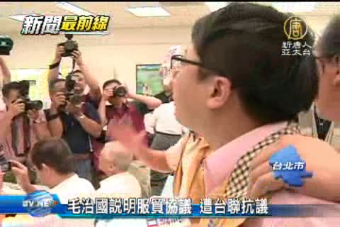 【新唐人亞太台2013年7月10日訊】台紐經濟合作協議順利簽定。不過來看到引起爭議極大的兩岸服貿協議。行政院副院長毛治國,今天(10日)前往旅行公會,說明服貿協議,但現場有台聯黨員到場抗議,打斷說明會,還和旅行公會爆發口角。