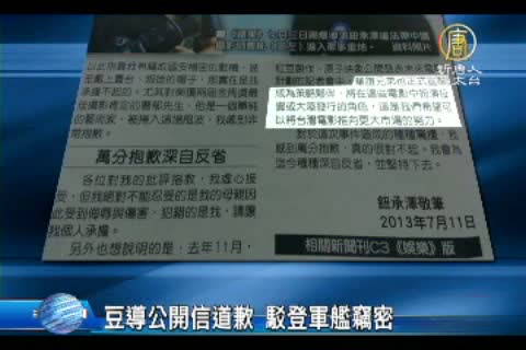 【新唐人亞太台2013年7月12日訊】導演鈕承澤新片衝過頭,瞞著軍方,夾帶中國攝影登軍艦勘景,遭到法辦,也被輿論圍剿,儘管已在回國時道歉,仍在今天登報發表公開信,他認為引發爭議的軍艦,其實很多民眾也搭過,如果因此要說他竊取國安機密,扣上賣台的帽子,他實在難以承擔。