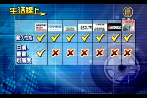 【新唐人亞太台2013年7月15日訊】行政院消保處抽查市售輪胎,10款當中竟然有8款不合格,不合格率高達8成,包含日本品牌東洋四季、費德勒等大廠,輪胎上頭沒有清楚標示重量、製造日期、耐磨指數等中文字樣,讓消費者購買時,無法清楚辨識,要求業者限期改善。