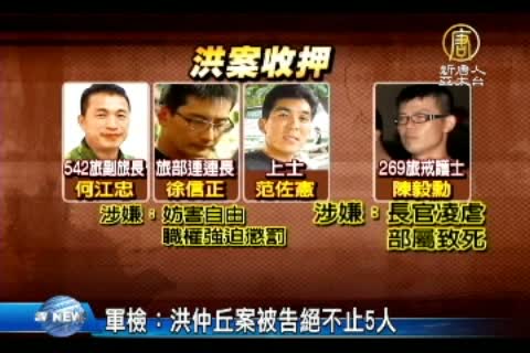 【新唐人亞太台2013年7月23日訊】針為陸軍義務役下士洪仲丘案,最高軍事法院檢察署檢察長曹金生少將表示,立案被告絕不止於現在這五個人。軍檢目前向法院聲押獲准涉案人員中,僅269旅禁閉室中士陳毅勳涉凌虐,其他已遭羈押涉案人員有陸軍542旅副旅長何江忠上校、542旅旅部連長徐信正與陸軍542旅旅部連范佐憲上士,以及上午聲押遭駁回的542旅副連長劉延俊。至於是否循江國慶案採聯合偵辦模式?曹金生表示,江案是有軍人及非軍人共同涉案,才聯合偵辦。洪案現有部分嫌犯,屬司法機關審判權,這部分已聯合偵辦,桃園地方法院檢察署已介入調查湮滅證據部分。