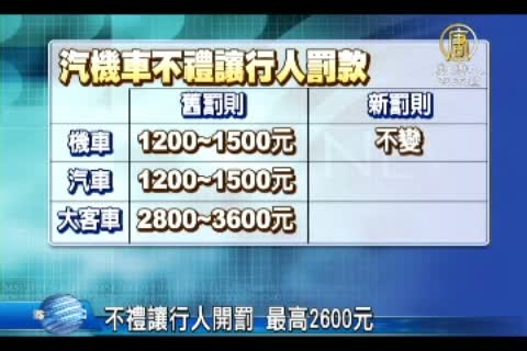 【新唐人亞太台2013年7月25日訊】汽車族以後開車得當心荷包了!原本交通部8月開始,要加重汽車不禮讓行人罰款,最高開罰2600元,沒想到7月15日,政策就提前上路,部分駕駛抱怨,罰款金額提高,被開罰後才知道。