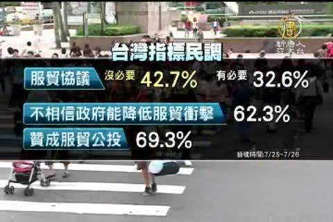 根據台灣指標民調調查,有42.7%民眾認為沒必要簽訂服貿協議,高於認為有必要的32.6%,另外,62.3%民眾不相信政府能夠降低服貿協議衝擊,69.3%民眾贊成以公投決定是否簽署服貿協議。