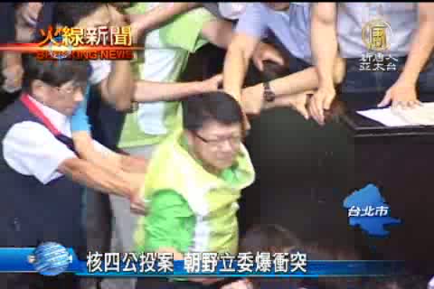 【新唐人亞太台2013年8月2日訊】火線新聞,首先看到。立法院二次臨時會,周五預計處理核四公投案,由於民進黨堅決立即停建核四廠,不得再由公投決定,所以在昨天(1日)晚上就搶進議場,要讓會議開不成,因此與前來清場的國民黨立委,發生幾波嚴重衝突。
