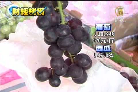 【新唐人亞太台2013年8月5日訊】來看到今天的財經訊息。行政院主計總處公布7月份物價指數CPI為102.61,比上個月跌0.14%,較去年同月漲0.08%,物價漲幅創下近35個月來新低。其中最大因素就是因為水果價格,比去年同期下跌2成,也創下自民國88年以來,14年來最大跌幅,讓水果攤商叫苦連天,生意真的不好做。
