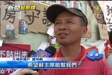 【新唐人亞太台2013年8月9日訊】今天(9日)早上民進黨主席蘇貞昌,到苗栗大埔探視在上個月被強拆的四個受災戶,除了聆聽受災戶的陳情,也到拆遷現場了解實際狀況。蘇貞昌說,徵收這四戶 的理由牽強,沒有必要性及公益性。而且政府三年前的承諾跳票,讓人民失望。彭秀春等受災戶也當面陳情,表達希望能重建訴求。