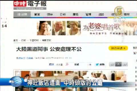 【新唐人亞太台2013年8月14日訊】台資旺旺集團在上海經營的「神旺大酒店」,與承租酒店副樓的KTV業者,因合約問題,一個禮拜以來,糾紛仍未停止,飯店經營遭癱瘓。今天(14日) 旺旺集團齊下媒體中國時報,以頭版頭條的方式,大篇幅報導,控訴對方找黑道、不明人士盤據大廳,癱瘓飯店營運,而中國警方處理態度消極,演變成神旺與上海警方的直接對嗆,上千名員工齊聚飯店門口示威,怒斥警方包庇KTV業者。