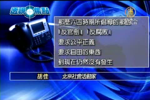 北京社會活動家 胡佳:「24年過去了,我們還是一黨專政的狀態,我們仍然沒有享受到這種公民的權利、政治的權利,那麼六四時期所倡導的那些『反官倒』、『反腐敗』,要求公平正義,要求自由的東西到現在仍然沒有發生。24年可以是一代人呢,我們還能再等待嗎?」