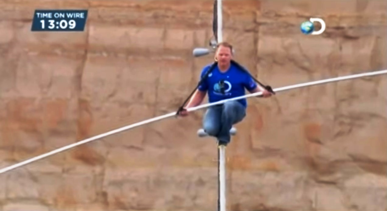 自稱為"鋼索飛人"的尼克 瓦倫達在全球217個國家的實況轉播下,以22分54秒,橫越壯麗的大峽谷,我們可以看到他腳下踩著直徑5公分的繩索,手拿著20公斤的平衡桿,穿過1400英尺長的鋼索。在大峽谷底下是川流不息的小科羅拉多河(Little Colorado River),尼克 瓦倫達完全沒有使用安全繩索的防護。