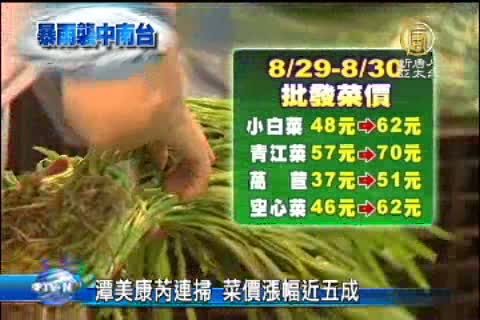 【新唐人亞太台2013年8月30日訊】康芮颱風帶來豪雨,嚴重影響中南部的蔬菜產地,導致今天台北市蔬果到貨量比昨天減少385公噸,平均蔬菜價格從昨天的一公斤32.2元,衝到37.4元,光是一天就貴了16%,其中漲最多的是小白菜、青江菜,還有空心菜等等。