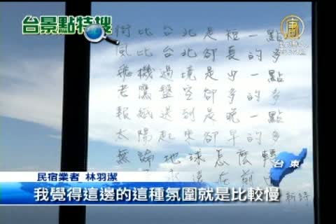 【新唐人亞太台2013年9月3日訊】東台灣的山景、海景還有人情味,很容易讓人愛上這裡的環境,有三個從事旅遊工作的女生,因為迷戀台東的景緻跟悠閒的步調,他們共同在這裡打造了一間能欣賞山、海美景的民宿,從此就在台東落腳,帶您到他們的民宿欣賞美麗的風景。
