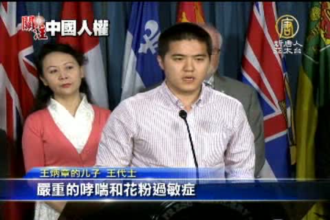 王炳章的兒子 王代士:「我爸爸在監獄裡曾三次中風,嚴重的哮喘和花粉過敏症,導致呼吸困難,生命處於危險之中。」