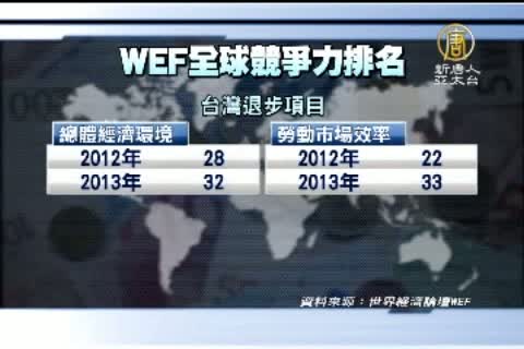 【新唐人亞太台2013年9月5日訊】世界經濟論壇,昨天(4日)公布2013到2014年的全球競爭力報告,在全球148國家中,台灣排名第12,比去年進步一名。不過,台灣在政府財政赤字,和總體經濟環境上,仍有待加強。