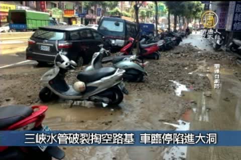 新北市三峽復興路自來水管上午突然破裂,造成路基掏空,1輛停放路邊的自小客車掉入坑內,附近一樓住戶也受池魚之殃,所幸無人受傷。目前自來水公司人員已經至封鎖路段全力搶修,至於水管破裂原因仍待調查釐清。