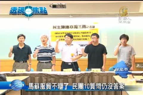 【新唐人亞太台2013年9月12日訊】立法院長王金平的黨籍遭撤銷,連帶讓15號的馬蘇「服貿協議辯論」被取消,對此,學者與民團表示,辯論取消,並不代表人民放棄關心,他們強調,政府到現在都沒有正面回應民團的十大質疑,國會應該退回、拒審服貿協議。