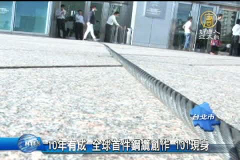 【新唐人亞太台2013年9月12日訊】全球首件退役鋼纜藝術創作現身台北101。由知名的環保重生藝術家康木祥打造的電梯鋼纜創作,長度可環繞台灣全島一圈,今天首度現身。吸引許多民眾的目光。