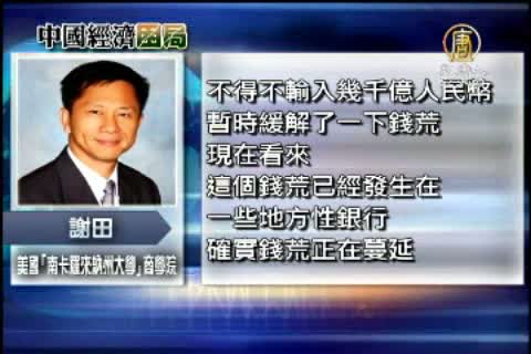 美國南卡羅萊納大學/艾肯商學院教授 謝田 :「一個多月前看到的錢荒,實際上是國有的中央銀行、大銀行在全國的範圍內的錢荒。後來,中國(共)政府不得不輸入幾千億人民幣暫時緩解了一下錢荒。現在看來,這個錢荒已經發生在一些地方性銀行,確實錢荒正在蔓延。」