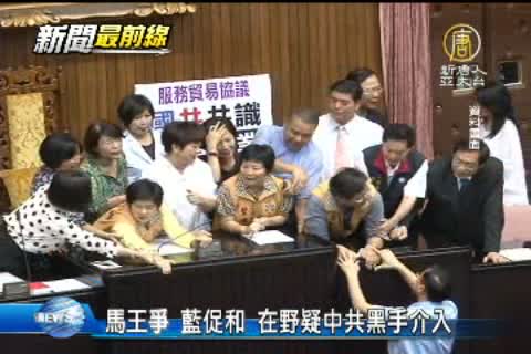 【新唐人亞太台2013年9月17日訊】馬王政爭延燒一個多禮拜,今天立院如期開議,國民黨立委公開促總統、立法院長和解;不過,在野立委質疑,整場紛爭有中共黑手介入,目的是希望兩岸服貿協議盡速過關,對於這樣的說法,立法院長王金平今天只是低調回應。