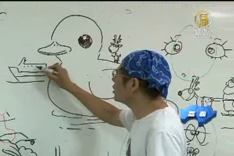 漫畫家 林耀煌 (奇兒):「(黃色小鴨)我們是畫在那個海上面,所以會加一些水的波紋的部分。讓它感覺比較巨大的時候,我們就可以加一些小動物或者是小人物都可以。」