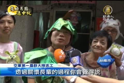 【新唐人亞太台2013年9月18日訊】中秋節,台南空軍第一基群大隊志工,打扮成月娘神話故事人物,與華山基金會的工作人員,一起到社區關懷問候獨居的長輩,送上中秋禮品,在柚子上彩繪,寫上中秋節祝福的話,要讓長輩感受到年節團聚的氣氛 。