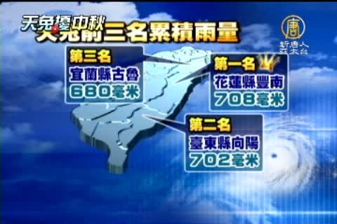 天兔襲台期間,東半部大豪雨不斷,累積雨量第一名,就是花蓮縣豐南,708毫米,第二名臺東縣向陽702毫米,第三名宜蘭縣古魯,680毫米。