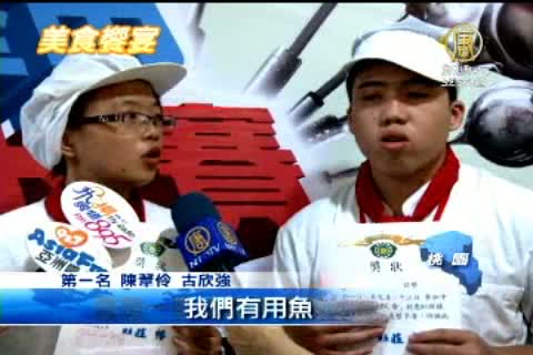 創意料理賽第一名 陳葦伶 古欣強:「我們都用利用蔬果類,去取代一些比較,當地的蔬果,取代肉啊!還是一些比較不環保的食物,我們有用魚、我們有用雞肉,白肉取代紅肉,我們用一些水果,是蕃茄、紅蘿蔔、小黃瓜、然後茭白筍、韭菜花,幾乎都是用汆燙或用蒸的方式,少油。」