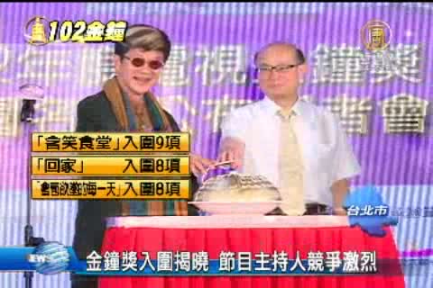 【新唐人亞太台2013年9月26日訊】2013年電視金鐘獎入圍名單今天(26日)揭曉,其中以綜藝節目與綜藝節目主持人競爭激烈,包括陶晶瑩、胡瓜、張小燕、侯佩岑,將爭奪節目與主持人獎項,另外,「含笑食堂」入圍9項最多,「回家」、「含苞欲墜的每一天」則是各入圍8個獎項。