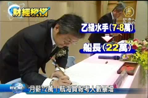 【新唐人亞太台2013年9月27日訊】交通部航海人員考試,上午放榜,今年總共有688人報考,比去年同期,暴增7成8,有考生表示,就是衝著上看12萬元的高薪才跳槽過來,而海運界人士直言,不少台灣船長,都已經60、70歲,還在跑船,憂心國內海運人才未來會出現斷層。