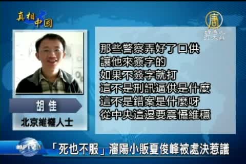 【新唐人亞太台2013年9月27日訊】9月25號,誤殺城管的大陸瀋陽小販夏俊峰被執行死刑。儘管大量網友和律師向當局疾呼「刀下留人」,僵持了四年之久也沒有挽回夏俊峰的生命。夏俊峰的妻子張晶在接受本台記者採訪時透露,夏俊峰到死都沒有認罪,拒絕在死亡書上簽字,並對妻子說,只要家裡有一個人活著,都要上訴,自己死了也不服。