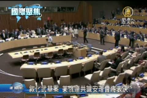 【新唐人亞太台2013年9月27日訊】美國和俄羅斯就銷毀敘利亞化武決議草案達成一致後,聯合國安理會在星期四晚間召開了緊急閉門會議,對這項決議草案進行審議。外交官們說,可能會在星期五(27號)晚間進行表決。