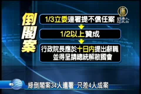 【新唐人亞太台2013年10月2日訊】民進黨主席蘇貞昌1日宣布,兩週內將啟動罷免、彈劾、倒閣的憲政行動,黨籍立委葉宜津的倒閣提案,現在已經有34人連署,只差4人就能成案。民進黨立委今天(2日)向立法院長王金平喊話,希望王金平發揮他的國會影響力,讓倒閣案可以過關,不過王金平說,他不予置評。